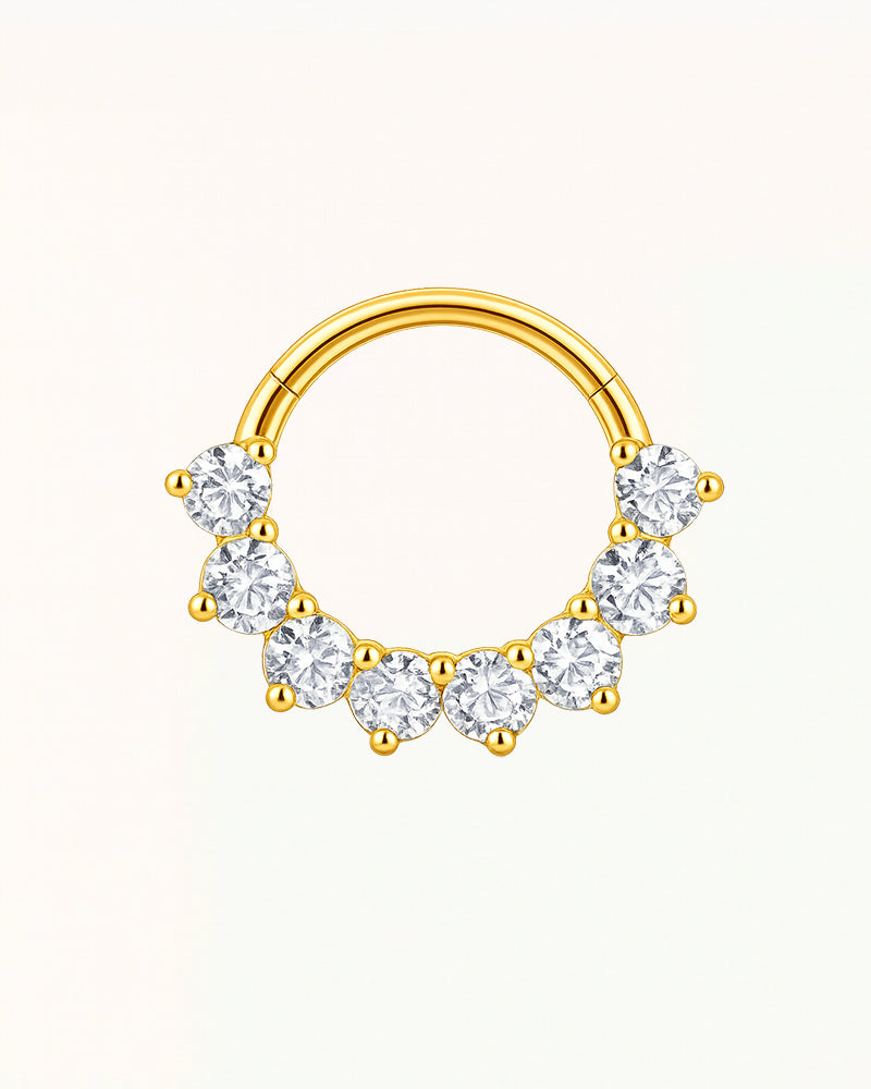 Dieser elegante, ringförmige Piercingschmuck besticht durch eine Reihe funkelnder, rundgeschliffener Edelsteine, die zusammen einen luxuriösen und edlen Look erzeugen. Die sorgfältig platzierten Steine folgen der natürlichen Rundung des Rings und schaffen so ein harmonisches und ausgewogenes Design, das sofort ins Auge fällt.