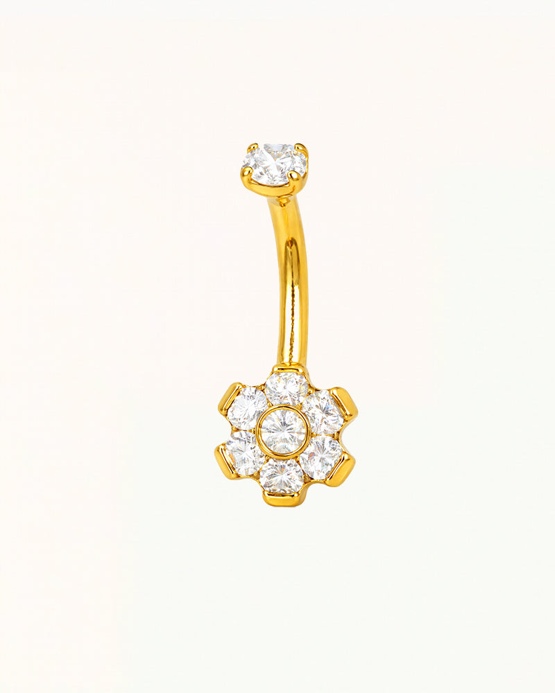 This curved rook piercing with a flower-shaped cluster of sparkling stones gives the auricle an elegant and luxurious look. The refined floral design with multiple sparkling stones creates a striking yet stylish accent that perfectly complements the anatomy of a rook piercing.
