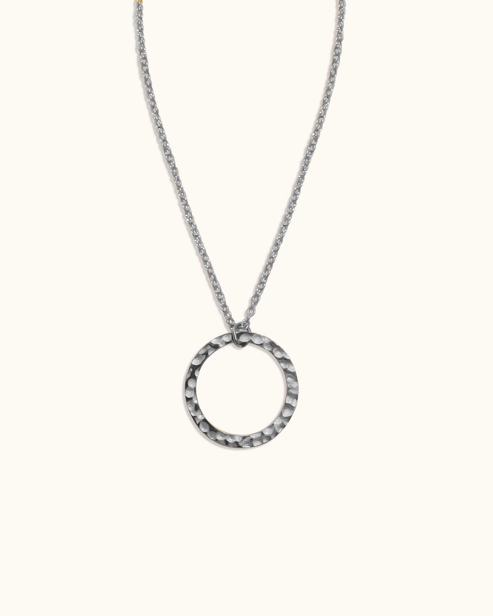 Deze ketting met gehamerde cirkelhanger is een subtiele eyecatcher met een stoere touch. De textuur in de cirkel geeft een handgemaakte, unieke uitstraling, terwijl het tijdloze silhouet makkelijk te combineren is met andere kettingen of op zichzelf gedragen kan worden.