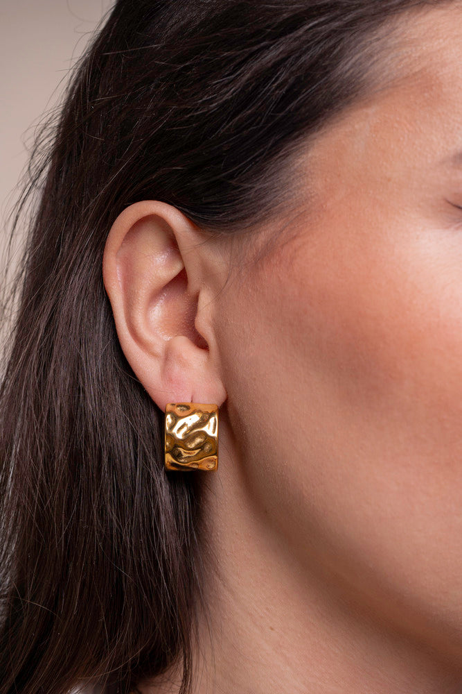 Voor een statement met karakter kies je deze gouden hoops met gehamerde afwerking. Het robuuste, brede ontwerp wordt verzacht door de organisch gevormde textuur die doet denken aan handgemaakt vakmanschap. Deze oorbellen combineren moeiteloos kracht met elegantie – perfect voor wie houdt van opvallende sieraden met een artisanale feel.