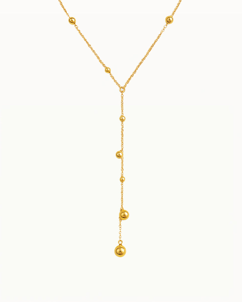 Voeg een vleugje verfijning toe aan je look met deze elegante gouden Y-ketting. Het tijdloze ontwerp bestaat uit een fijne ketting met subtiele gouden kralen die speels langs de ketting zijn verdeeld, met een langere Y-vormige hanger voor een slank en verlengend effect.