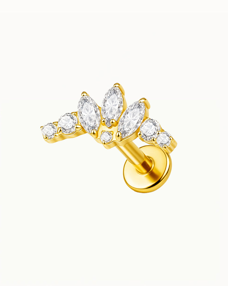 Deze verfijnde titanium piercing is een echte eyecatcher dankzij het waaierachtige ontwerp met meerdere glinsterende steentjes. De combinatie van ronde en marquise geslepen elementen zorgt voor een sierlijke en luxe uitstraling.