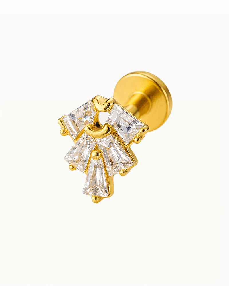 Deze titanium piercing is een ware eyecatcher, geïnspireerd op de elegantie van art deco. De combinatie van baguette-geslepen steentjes in een waaierachtige opstelling en het midden zorgt voor een luxueuze, symmetrische uitstraling.