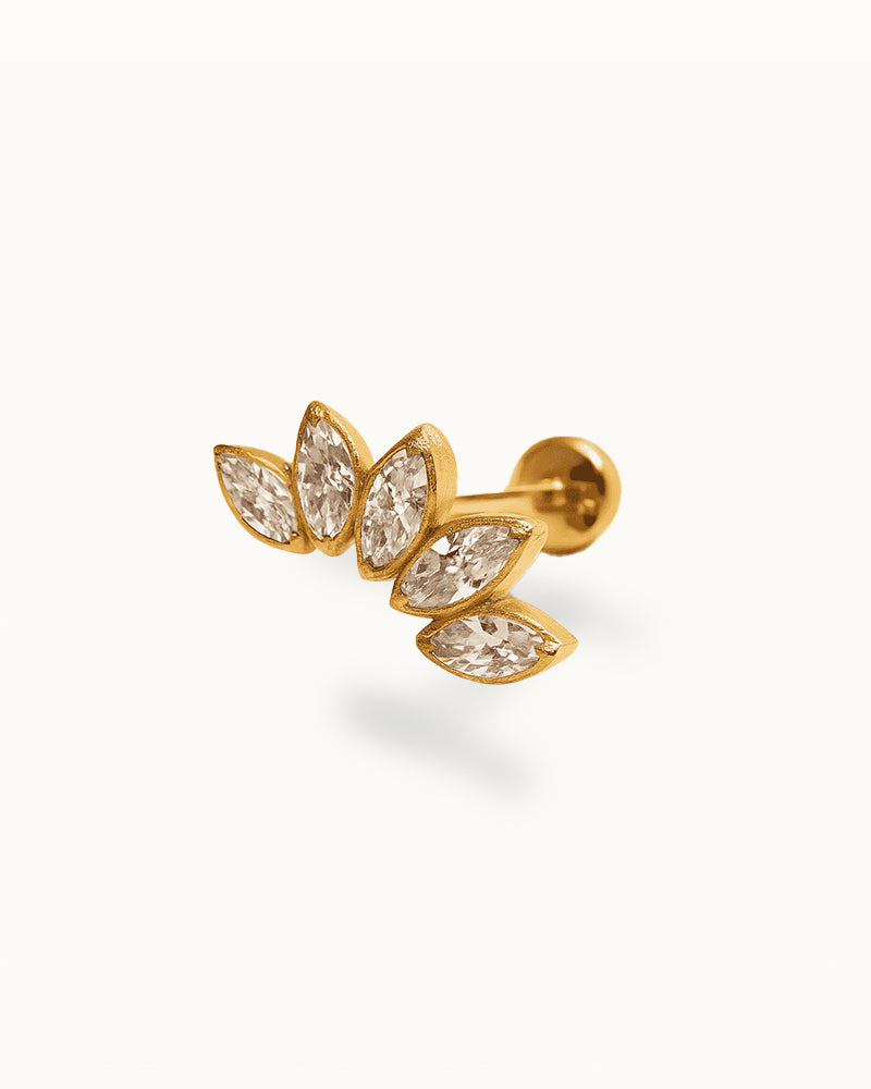Vijf marquise-geslepen steentjes vormen samen een vloeiend, bladachtig cluster dat subtiel om het oor krult. Het organische design straalt zachtheid en verfijning uit, met een moderne afwerking die perfect past bij zowel minimalistische als opvallende ear stacks.