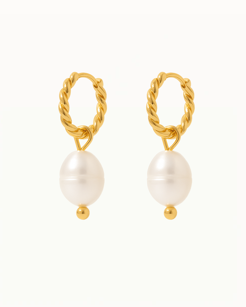 Deze verfijnde oorbellen combineren een stijlvolle gedraaide gouden ring met een klassieke parelhanger, wat zorgt voor een tijdloos en chic accent. Perfect voor zowel alledaagse outfits als feestelijke gelegenheden.